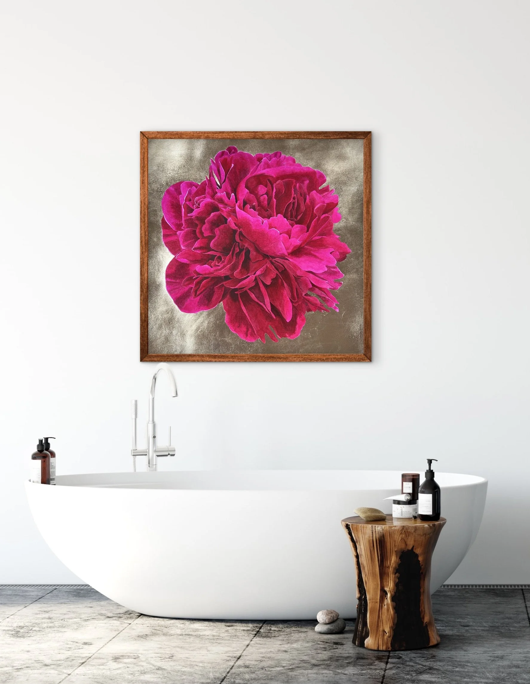 Original watercolor and gold leaf painting of a fuchsia peony